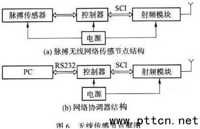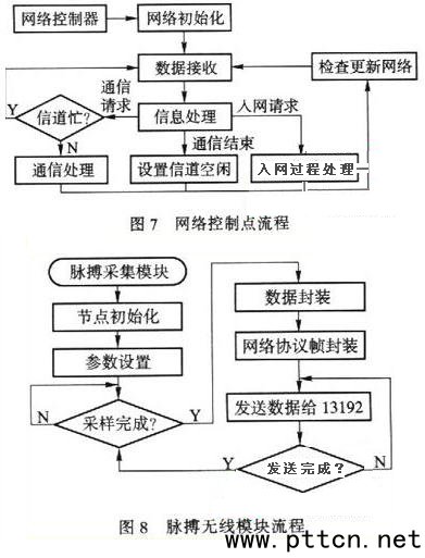 設(shè)計(jì)時應(yīng)考慮到高頻電路對傳感器信號的干擾,傳感器調(diào)理電路與高頻發(fā)射接收部分可分開設(shè)計(jì).天線設(shè)計(jì)是無線模塊設(shè)計(jì)的關(guān)鍵,直接影響到傳感器節(jié)點(diǎn)的通信質(zhì)量和通信距離.可以參照常用的2.4GHz天線的設(shè)計(jì)方法本設(shè)計(jì)采用了偶極子微帶PCB板天線,所有銅箔走線均采用微帶傳輸線的原理.以減少發(fā)射引起的傳輸損耗,獲得了比較大的輸出功率和較高的接收靈敏度.GT60和MCl3192的供電電壓都是3V,系統(tǒng)可以采用紐扣電池供電其他節(jié)點(diǎn)的設(shè)計(jì)與脈搏傳感無線節(jié)點(diǎn)的設(shè)計(jì)相似. 網(wǎng)絡(luò)控制器和脈搏傳感節(jié)點(diǎn)的應(yīng)用程序流程如圖7、圖8所示.