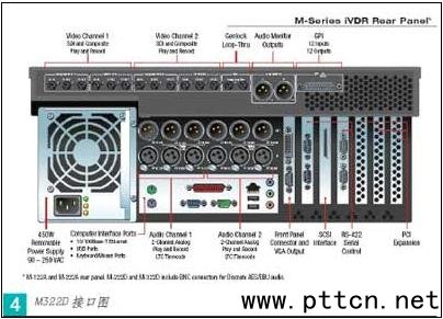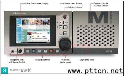 出于應(yīng)用和維護(hù)上的考慮,江蘇電視臺(tái)新聞演播室和體育演播室選用的是ThomsonGrassValleyM322D硬盤錄像機(jī),它是4通道PC系統(tǒng)式硬盤錄像機(jī)。下面結(jié)合這款機(jī)型,談?wù)勎覀冊谑褂煤途S護(hù)中體會(huì)到的硬盤錄像機(jī)應(yīng)用上的特點(diǎn)。1.ThomsonGrassValleyM322D的主要參數(shù)和特點(diǎn) ThomsonGrassValleyM322D的4個(gè)通道被配置為2個(gè)錄制通道和2個(gè)播放通道。錄制通道為BNC接口,可由軟件選擇SDI數(shù)字視頻或復(fù)合信號,播出通道分別為兩路SDI數(shù)字視頻或復(fù)合信號輸出,每通道兩路BNC輸出。M322D可以軟件選擇設(shè)置525線NTSC制式或625線PAL制式?蓚鬏?shù)男盘栴愋蜑镹TSCSMPTE170M,PALCCIR624,SDI-SMPTE259M,ITU-601和270Mb/s復(fù)合數(shù)字信號。音頻通道為每視頻通道兩路模擬音頻輸入/輸出,每視頻通道4軌SDI嵌入及2路AES/EBU。 壓縮格式為DV25SMPTE314、DV25、MPEG-2(4:2:2)、DV50(4:2:2)、MPEG-2(4:2:2),碼率可選25Mb/sI幀或50Mb/sI幀。 ThomsonGrassValleyM322D提供了觸摸屏方便操作,并支持傳統(tǒng)數(shù)安錄像機(jī)功能,如快進(jìn)、快退、搜索、打點(diǎn)及音頻監(jiān)聽等。 三塊硬盤組成陣列最大可存儲(chǔ)64小時(shí)25Mb/s的素材,可隨意對素材進(jìn)行剪輯和格式轉(zhuǎn)換(支持AVI、DV25、SMPTE360M)。提供豐富的接口,如1394、USB2.0等方便與移動(dòng)存儲(chǔ)設(shè)備的連接。 ThomsonGrassValleyM322D的操作面板和各種接口如圖3和圖4所示。
