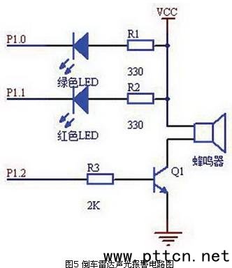 報警模塊采用簡單的聲光報警電路,如圖5所示。先設(shè)定一個臨界值,當(dāng)車尾與障礙物的距離小于設(shè)定的最小距離時,紅色指示燈閃亮,綠色指示燈熄滅。單片機向其端口發(fā)出PWM脈沖,隨著距離的減小,通過控制PWM脈沖的占空比使閃光和蜂鳴的頻率加劇,以此來提示駕駛員。