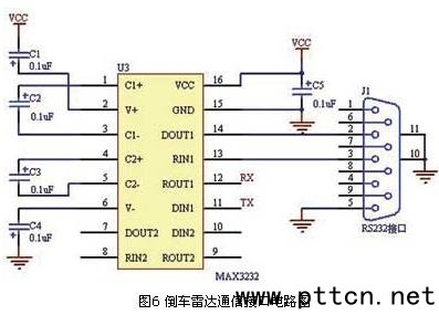 通信接口電路如圖6所示。采用美信的MAX3232芯片,外圍電路非常簡單,只需要5個0.1μF的電容器。該電路把單片機串口輸出信號隔離變換成RS-232信號發(fā)送到汽車總線上,同時還可以實現(xiàn)該系統(tǒng)與計算機的通信。