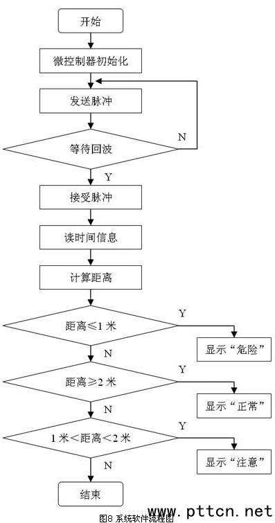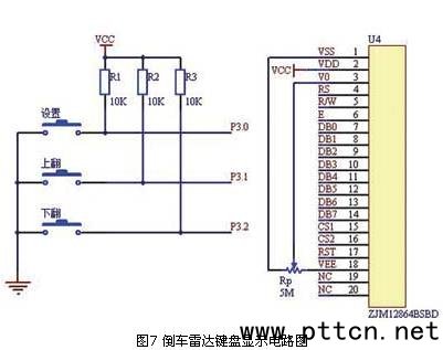 鍵盤和顯示電路如圖7所示,由鍵盤和液晶顯示兩部分組成。其中鍵盤采用獨立式按鍵,有3個按鍵,一個設(shè)置鍵、一個上翻鍵、一個下翻鍵?梢赃M行報警值、工作方式、時鐘等各個參數(shù)的設(shè)置。液晶顯示電路采用ZJM12864BSBD這款低功耗的點陣圖形式LCD,顯示格式為128點(列)×64點(行),具有多功能指令,容易使用,可實時的顯示時鐘、距離和報警提示信息,方便直觀。 系統(tǒng)軟件設(shè)計