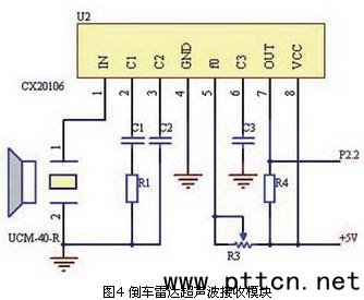 超聲波接收電路如圖4所示。這是本系統(tǒng)設(shè)計和調(diào)試的一個難點。壓電陶瓷型超聲波接收器UCM-40-R接收反射的超聲波轉(zhuǎn)換為40kHz毫伏級的電壓信號,需要經(jīng)過放大、處理、才能用于觸發(fā)單片機中斷。一方面?zhèn)鞲衅鬏敵鲂盘栁⑷酰捎诜瓷錀l件不同,需要放大倍數(shù)的范圍大約是100~5000,另一方面?zhèn)鞲衅鬏敵鲎杩馆^大,需要高輸入阻抗的多級放大電路,而高輸入阻抗容易接收干擾信號。通常采用兩種方案:一是采用運算放大器組成多級選頻放大電路;二是采用專用的集成前置放大器。第一種方案容易產(chǎn)生自激振蕩,要使接收電路達到很好靈敏度和抗干擾效果,電路的調(diào)試是較困難的。本系統(tǒng)采用專用的集成電路前置放大器CX20106,它由前置放大器、限幅放大器、帶通濾波器、檢波器、積分器、整型電路組成。其中前置放大器具有自動增益控制功能,可以保證在超聲波傳感器接收較遠(yuǎn)反射信號輸出微弱電壓時放大器有較高的增益,在近距離輸入信號強時放大器不會過載。調(diào)節(jié)芯片引腳5的外接電阻R3,將它的濾波器的中心頻率設(shè)置在40kHz,達到了很好的效果。當(dāng)接收到與濾波器中心頻率相符的信號時,其輸出引腳7輸出一個低電平,而輸出引腳7直接接到MSP430F2274的P2.2上,以觸發(fā)中斷。