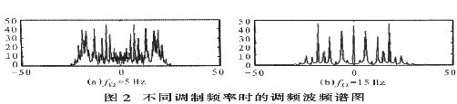 式中:ma為調(diào)制指數(shù);VCM為載波振幅。 單音調(diào)頻信號的頻譜相對復雜,可設調(diào)制信號頻率為fΩ;調(diào)制頻偏為△f,則信號帶寬近似為2△f;譜線間間隔為調(diào)制信號頻率fΩ,而各個譜線的高度則由貝塞爾函數(shù)得到。△f反映調(diào)頻波所占帶寬,△f越大,占用的帶寬也越大,但每根譜線的間隔是不變的。 由圖2可知,fΩ影響每根譜線之間的間隔,fΩ越小,頻譜線的間隔也越小,頻譜看起來越緊密;fΩ越大,頻譜線間隔越大,頻譜看起來則越稀松。但頻譜占用帶寬是不變的。