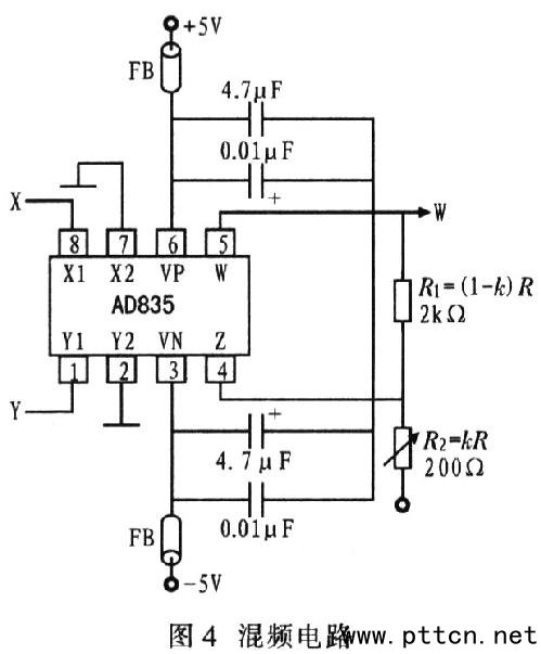 由于AD985l產(chǎn)生的信號含有一定的高頻諧波,因而可采用低通橢圓濾波器濾除高頻分量。AD985l輸出信號幅值不穩(wěn)定,且不符合AD835的輸入要求,因而采用AD603程控放大。AD603單片增益范圍為一10~+30dB,輸入控制電壓范圍為0~1V,增益與控制電壓的關(guān)系為Gain(dB)=40Vg+10。而AD603的輸入控制電壓由單片機通過D/A轉(zhuǎn)換器提供。D/A轉(zhuǎn)換器采用MAX5532。 4.2混頻電路