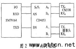 1.2、CM300模塊 CM300是華為公司推出的一款無線數(shù)據(jù)傳輸模塊,支持短消息、高質(zhì)量語音和無線數(shù)據(jù)等業(yè)務(wù)。該模塊工作電壓為3.3~4.5V,工作頻段為800MHz。模塊采用CDMA2000—1X空中接口技術(shù),擁有153Kb/s的全雙工無線傳輸數(shù)據(jù)的能力,涵蓋CDMA所有的標(biāo)準(zhǔn)的語音和數(shù)據(jù)應(yīng)用的AT指令。該模塊內(nèi)嵌了TCp/IP協(xié)議,用戶通過簡單的AT命令就能實(shí)現(xiàn)數(shù)據(jù)傳輸。 CM300模塊還提供了一個(gè)8位LCD接口、一個(gè)標(biāo)準(zhǔn)的IIC接口、一個(gè)標(biāo)準(zhǔn)的USB接口和2路RS232雙工串口,串口的最大速率達(dá)到230.4Kb/s。本系統(tǒng)中的MCU就是通過其中一個(gè)串口與CM300之間進(jìn)行數(shù)據(jù)通信的,通信使用的波特率采用230.4Kb/s。但是SM79164只有一個(gè)串口,不能滿足同時(shí)與串口攝像頭和CM300通信的需要,因此我們采取兩個(gè)模塊共用一個(gè)串口的方法。圖2為單片機(jī)串口復(fù)用框圖,CD4053是三組兩路模擬開關(guān)芯片,由SM79164的一個(gè)I/O引腳作為它的選通信號(hào)。