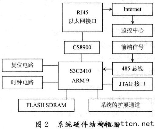 系統(tǒng)的上層設(shè)計(jì)了可以與Internet直接相連的網(wǎng)絡(luò)接口,能夠?qū)⑾到y(tǒng)直接掛接入Internet信息網(wǎng)。只要給嵌入式操作系統(tǒng)分配一個(gè)IP地址,不用為每個(gè)生產(chǎn)設(shè)備在接入網(wǎng)絡(luò)之后都分配一個(gè)IP地址,整個(gè)底層設(shè)備統(tǒng)一由CGI編程采用自己設(shè)定的地址識(shí)別各個(gè)硬件設(shè)備,這樣就大大節(jié)約了IP地址的使用。 遠(yuǎn)程客戶端,只要能夠上網(wǎng),就可以授權(quán)用戶通過(guò)IP地址登錄到該系統(tǒng),監(jiān)控整個(gè)生產(chǎn)過(guò)程和設(shè)備的相關(guān)信息。同時(shí)該系統(tǒng)還提供了一個(gè)接口,用以生產(chǎn)現(xiàn)場(chǎng)的監(jiān)控,可讓一線員工在現(xiàn)場(chǎng)直觀地了解和記錄有關(guān)的生產(chǎn)信息。 2.2 系統(tǒng)方案分析 該方案的遠(yuǎn)程監(jiān)控系統(tǒng)結(jié)構(gòu)是采用B/S模式,相對(duì)于傳統(tǒng)的C/S模式結(jié)構(gòu)而言,三層的B/S體系結(jié)構(gòu)是把原來(lái)在客戶機(jī)一側(cè)的應(yīng)用程序模塊與顯示功能分開(kāi),將它放到Web服務(wù)器上單獨(dú)組成一層,客戶機(jī)上只需通過(guò)單一的瀏覽器,這樣就可以把負(fù)荷均衡的分配給Web服務(wù)器,客戶機(jī)上的壓力大大減輕。B/S結(jié)構(gòu)主要是利用不斷成熟的Web瀏覽器技術(shù),結(jié)合瀏覽器的多種編程語(yǔ)言和Web技術(shù),用通用的瀏覽器就實(shí)現(xiàn)了原來(lái)需要復(fù)雜專用軟件才能實(shí)現(xiàn)的強(qiáng)大功能,并節(jié)約了開(kāi)發(fā)成本。 整個(gè)系統(tǒng)是在嵌入式系統(tǒng)中移植入實(shí)時(shí)的嵌入式Linux操作系統(tǒng),并安裝了Web服務(wù)器,充當(dāng)中間件的功能。底層控制網(wǎng)絡(luò)通過(guò)RS 485總線組網(wǎng)后,以RS 485總線接入系統(tǒng)的硬件端,將所采集的數(shù)據(jù)和相關(guān)信息放入到Linux Web服務(wù)器中,使得嵌入式設(shè)備與底層設(shè)備能互相通信。由于在一些環(huán)境惡劣的工業(yè)生產(chǎn)現(xiàn)場(chǎng),并不適合用PC機(jī)作服務(wù)器,采用ARM等系列嵌入式系統(tǒng)具有功耗低,穩(wěn)定性好,可靠性高等特點(diǎn)。 3 系統(tǒng)的硬件平臺(tái) 該系統(tǒng)對(duì)車間浸油罐進(jìn)行數(shù)據(jù)采集和遠(yuǎn)程監(jiān)控,所選擇的嵌入式微處理器必須能夠在所生產(chǎn)的環(huán)境中進(jìn)行可靠的工作。這里所討論的嵌入式遠(yuǎn)程監(jiān)控系統(tǒng)所選擇的CPU是S3C2410處理器。S3C2410是韓國(guó)Sa―mstmg公司出產(chǎn)的一款基于ARM920T內(nèi)核的16/32位RISC嵌入式微處理器,主要面向高性價(jià)比、低功耗的手持式設(shè)備的應(yīng)用。其整個(gè)硬件框圖如圖2所示。  其中的核心模塊包括CS8900,RS 485總線接口,F(xiàn)LASH SDRAM,復(fù)位和時(shí)鐘電路等;主要功能是工業(yè)現(xiàn)場(chǎng)信息采集和與遠(yuǎn)程客戶機(jī)的通信。由于Linux操作系統(tǒng)中直接包含有TCP/IP等各個(gè)網(wǎng)絡(luò)協(xié)議,因此直接在平臺(tái)上進(jìn)行Linux操作系統(tǒng)的移植,就免去了開(kāi)發(fā)網(wǎng)絡(luò)協(xié)議的難度。系統(tǒng)提供了一個(gè)RJ45以太網(wǎng)接口,直接可以與Internet進(jìn)行通信。該系統(tǒng)重點(diǎn)用以解決與Internet的通信問(wèn)題和信息發(fā)布問(wèn)題。