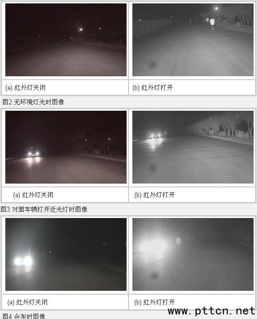 3.紅外燈設(shè)計 鹵素紅外燈是鹵素?zé)艏蛹t外濾光片,吸收可見光,只發(fā)出近紅外光。汽車照明中最常用的光源是鹵素?zé)簦l(fā)出的光線是包含可見光和近紅外的連續(xù)光譜,并且近紅外光的輸出量比較大,約占總能量的1/3,可根據(jù)需要選用不同波長的紅外濾光片得到不同波長和不同帶寬的紅外線,目前主動汽車夜視系統(tǒng)中大都采用鹵素光源作為汽車紅外燈光源,它具有照射距離遠(yuǎn),輻射均勻,連續(xù)波長,體積小等優(yōu)點,缺點是壽命短,約為8000個小時。 紅外LED是由紅外發(fā)光二級管矩陣組成的發(fā)光體,采用紅外輻射效率比較高的材料GaAs制成的,產(chǎn)生單色光源,其光譜功率分布為中心波長830~950nm,半峰帶寬約20nm左右的窄帶分布,為紅外敏感傳感器可感應(yīng)的范圍,夜視系統(tǒng)常用中心波長是850nm。它一個顯著的優(yōu)點是可以實現(xiàn)脈沖頻閃,進(jìn)而實現(xiàn)LED的輻射脈沖與相機(jī)的曝光窗口同步。主動夜視系統(tǒng)的一個重要問題是兩輛都裝有近紅外光源的車輛相向行駛時,會使對方產(chǎn)生暫時的盲區(qū),而脈沖式LED紅外燈可以與本車相機(jī)的曝光窗口同步,就不會出現(xiàn)暫時盲區(qū)的現(xiàn)象。 由于LED紅外燈的壽命比較長,穩(wěn)定性高,又可脈沖式操作,是比較理想的紅外照明系統(tǒng),本系統(tǒng)選用LED紅外燈,并實現(xiàn)其脈沖輻射與相機(jī)曝光同步。圖2,圖3,圖4是紅外燈打開和關(guān)閉時采集的夜間圖像。 在無路燈的道路上,本車車燈的輻射范圍有限,遠(yuǎn)處的道路和目標(biāo)都不清楚,并且整個視野內(nèi)圖像相對比較暗,如圖2(a),而在本系統(tǒng)的紅外燈和紅外相機(jī)的配合下,可將更寬更遠(yuǎn)的道路圖像清晰地影射到顯示器上,并且圖像清晰,明暗均勻,行人更加突出,對比度好,如圖2(b);對面車輛打開近光燈,紅外圖像中的行人比普通圖像中的行人更清晰,如圖3;兩車會燈時,車輛前方道路比較暗,大燈附近比較亮,燈光陰影中的行人被強光遮擋,而打開紅外燈后,車輛前方道路清晰,可視距離遠(yuǎn),并且燈光陰影中的行人突出,清晰可見,如圖4。