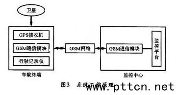 1.2工作原理 本系統(tǒng)的工作原理如圖3所示,其中車載終端主要負(fù)責(zé)車輛的定位、發(fā)送位置信息、接收并處理監(jiān)控中心下行數(shù)據(jù)或命令;監(jiān)控中心則負(fù)責(zé)接收并處理移動(dòng)單元的上行數(shù)據(jù),同時(shí)在監(jiān)控平臺(tái)上形象、直觀地顯示車輛的位置和狀態(tài),并根據(jù)需要進(jìn)行指揮調(diào)度;GSM通信網(wǎng)絡(luò)負(fù)責(zé)監(jiān)控中心和移動(dòng)單元之間數(shù)據(jù)的無(wú)線傳輸,該傳輸采用GSM短信息方式,GPS車載臺(tái)的定位數(shù)據(jù)經(jīng)過(guò)格式轉(zhuǎn)換后,可利用GSM手機(jī)的短信息信道傳到監(jiān)控中心,監(jiān)控中心亦可通過(guò)GSM短信息信道向車輛發(fā)送指揮調(diào)度信令。GSM短信息方式具備GSM語(yǔ)音調(diào)制方式覆蓋范圍大和容量大的優(yōu)點(diǎn),同時(shí),短信息業(yè)務(wù)也具備傳輸速度快、不影響語(yǔ)音通話、價(jià)格便宜等優(yōu)點(diǎn)。
