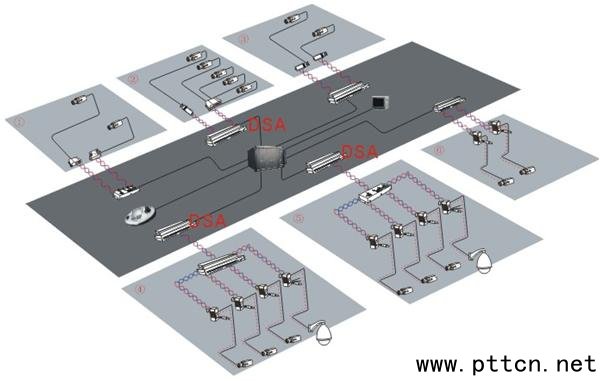 從圖中可以看出,DSA技術(shù)就是自動(dòng)適應(yīng)不同距離衰減特性,并在各個(gè)頻帶上實(shí)現(xiàn)不同的增益調(diào)整,使其調(diào)整后的波形能最大程度的恢復(fù)成初始的視頻信號(hào)。DSA技術(shù)與普通的UTP傳輸器相比,對(duì)衰減的增益補(bǔ)償更為細(xì)膩,對(duì)高頻信號(hào)有著較好的補(bǔ)償,使得視頻經(jīng)過傳輸后還具有更好的清晰度、色彩度。 3)多路圖象的一致性: 三、在混合系統(tǒng)中的應(yīng)用 由于DSA技術(shù)的發(fā)展,極性自動(dòng)識(shí)別、增益自動(dòng)調(diào)整,UTP傳輸器的安裝、調(diào)試變的簡(jiǎn)潔,雙絞線的綜全布線等工程操作也十分方便。 在系統(tǒng)中,前端使用UTP傳輸器,經(jīng)過PVD HUB(供電UTP傳輸器HUB),再到中心控制室DSA設(shè)備,最后將視頻轉(zhuǎn)到DVR等設(shè)備。這樣做的一個(gè)好處就是PVD HUB到4路視頻匯集到一根CAT5線上,這樣硬件成本及人工成本上都會(huì)得到很大的減少;而且通過PVD HUB還解決了前端攝像機(jī)供電難的問題;在布線上均是通過CAT5網(wǎng)線形式連接,給綜合布線工程上也得到了很大的方便性。連接參考圖如下: