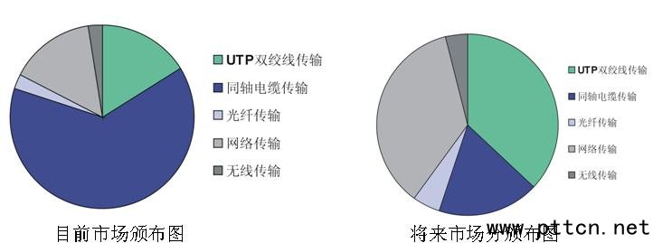 美中不足之處是普通UTP傳輸器在安裝時(shí),尤其是對(duì)多路不同傳輸距離信號(hào)的一致性調(diào)整時(shí)需要經(jīng)驗(yàn)豐富人員很仔細(xì)的對(duì)圖像進(jìn)行調(diào)整。否則不能達(dá)到理想的圖像效果。DSA技術(shù)在UTP視頻傳輸系統(tǒng)中的應(yīng)用成功的解決了這一問題。使UTP傳輸在安防工程中得到更廣泛的應(yīng)用。以下圖可以反應(yīng)出當(dāng)前市場(chǎng)的分布及發(fā)展趨勢(shì)。