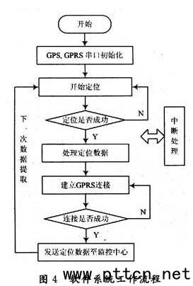 4.1系統(tǒng)工作流程 車載終端軟件系統(tǒng)的主要功能是由主程序完成的。主程序采用狀態(tài)機(jī)的系統(tǒng)結(jié)構(gòu),其工作流程如圖4所示。