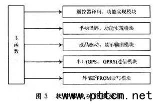 3.2GSM/GPRS+GPS模塊 采用SIMCOM公司的SIM508模塊。SIM508模塊是一款將三頻GSM/GPRS和具有20通道能力的GPS完全整合到一個(gè)模塊中(34mm×55mm×3mm)的產(chǎn)品。該產(chǎn)品的設(shè)計(jì)完全滿足車載應(yīng)用環(huán)境要求(溫度、濕度、防震等)。特別地,整合了附加元器件的SIM508可以節(jié)省很多時(shí)間和成本。SIM508支持NMEA-0183,SiRFbinary和RTCMSC-104三種GPS數(shù)據(jù)格式,能夠滿足不同的設(shè)計(jì)要求。車載終端通過(guò)模塊中的GPS部分獲得車輛的具體位置,經(jīng)過(guò)CPU處理后,顯示給用戶并通過(guò)GPRS部分將該信息發(fā)送到監(jiān)控中心,以實(shí)現(xiàn)對(duì)車輛的實(shí)時(shí)定位跟蹤,同時(shí)還能實(shí)現(xiàn)語(yǔ)音和短消息通信功能。 3.3輸入輸出模塊 輸出通過(guò)12232F液晶模塊實(shí)現(xiàn),可以顯示圖形,也可以顯示7.5×2個(gè)(16×16點(diǎn)陣)漢字,與外部CPU接口可以采用并行或串行,考慮到編程的簡(jiǎn)易性,本車載終端采用串行接口連接。 車載終端的輸入有兩種方式:遙控器輸入(主要輸入設(shè)備)和手柄輸入?紤]到緊急情況下手柄輸入的局限性,這里采用遙控器作為主要輸入設(shè)備,可以用來(lái)完成語(yǔ)音撥號(hào)、收發(fā)短消息、醫(yī)療求助、維修求助、啟閉設(shè)備等功能。手柄裝置包括確認(rèn)、返回和上、下翻動(dòng)四個(gè)功能鍵,為方便用戶輸入而設(shè)計(jì)。 4車載終端軟件設(shè)計(jì) 本軟件系統(tǒng)采用模塊化設(shè)計(jì)方法,每個(gè)模塊實(shí)現(xiàn)一個(gè)功能或一個(gè)協(xié)議,各功能模塊以子函數(shù)形式出現(xiàn),縮短了軟件開(kāi)發(fā)時(shí)間,易于程序修改和移植,同時(shí),在編寫軟件時(shí),還留有一些軟件應(yīng)用接口,便于軟件升級(jí),如增加新協(xié)議。軟件系統(tǒng)功能模塊如圖3所示。