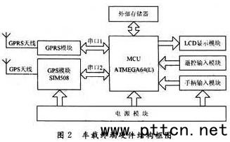 2車載終端的功能 車載GPS/GPRS終端的衛(wèi)星接收模塊采集到GPS衛(wèi)星數(shù)據(jù),經(jīng)過(guò)數(shù)據(jù)處理得到車輛的地理坐標(biāo)信息。該信息通過(guò)車載終端處理之后,由GPRS無(wú)線通信模塊發(fā)送到GPRS無(wú)線通信網(wǎng)上。GPRS網(wǎng)絡(luò)根據(jù)相應(yīng)的協(xié)議在車載終端和接人Internet網(wǎng)的監(jiān)控中心之間建立一條支持TCP/lP的數(shù)據(jù)通道。車載GPS/GPRS終端依靠該數(shù)據(jù)通道和監(jiān)控中心之間進(jìn)行信息的交互。監(jiān)控中心還可以通過(guò)該通道向下發(fā)送控制命令和服務(wù)信息。另外,除了車輛定位,系統(tǒng)還可以提供諸如防盜防搶、對(duì)移動(dòng)車輛進(jìn)行斷油斷電、顯示調(diào)度信息、醫(yī)療求助、移動(dòng)電話等多種服務(wù)。 3車載終端硬件設(shè)計(jì) 車載終端硬件系統(tǒng)以單片機(jī)和GPS+GPRS模塊為核心,屬于經(jīng)濟(jì)型功能終端,其結(jié)構(gòu)如圖2所示。