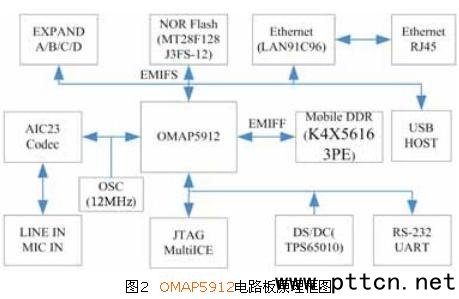系統(tǒng)硬件設(shè)計(jì) 系統(tǒng)硬件設(shè)計(jì)即為OMAP5912電路板的設(shè)計(jì),設(shè)計(jì)中,電源管理芯片采用TPS65010;DDR采用K4X56163PE芯片;NOR FLASH采用兩MT28F128J3FS-12芯片;音頻CODEC芯片采用TLV320AIC23;以太網(wǎng)接口芯片采用LAN91C96;另外還設(shè)計(jì)有USB接口、UART接口、音頻輸入輸出接口、JATG/Multi-ICE仿真調(diào)試接口及四個(gè)擴(kuò)展接口。OMAP5912 電路板原理框圖如圖2所示。