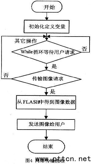根據(jù)上述關(guān)系可以通過(guò)編程實(shí)現(xiàn)數(shù)據(jù)格式的轉(zhuǎn)化。 2.3.3 圖像的捕捉 在PPI_ov7660中采用直接讀取的方法,直接讀取方法比較簡(jiǎn)單,通過(guò)調(diào)用read()函數(shù),將輸入的圖像數(shù)據(jù)復(fù)制到內(nèi)核緩沖區(qū)中,就可以實(shí)現(xiàn)對(duì)每幀圖像的讀取。過(guò)程如下: (1)通過(guò)調(diào)用函數(shù)malloc()為采集的圖像數(shù)據(jù)分配內(nèi)存; in_buff=(unsigned char*)malloc(IMG_SIZE) (2)通過(guò)調(diào)用read()函數(shù)將前端采集的圖像數(shù)據(jù)讀到in_buf中; Fd=read(fd_ppi,in_buff,IMG_SIZE) (3)通過(guò)調(diào)用write()函數(shù)將內(nèi)存中的圖像數(shù)據(jù)寫(xiě)到創(chuàng)建的一個(gè)file里。 fd=fopen(“pic”,“wb”)fwrite(in_buff,l,nOutputBytes,fd) 3 圖像的網(wǎng)絡(luò)傳輸與顯示 在uClinux平臺(tái)上采用服務(wù)器/客戶端模型通過(guò)建立TCP套接字來(lái)實(shí)現(xiàn)網(wǎng)絡(luò)的連接,本系統(tǒng)通過(guò)基于TCP協(xié)議的socket編程,完成了圖像數(shù)據(jù)的發(fā)送和客戶端的接收程序。流程圖如圖4所示。