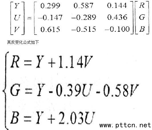ioctl(fd_ppi,CMD_PPI_GET_VIDEOIN,&video_in) (3)獲取影像信息 利用相應(yīng)的ioctl()函數(shù)取得影像支持信息,包含設(shè)備采集圖像的各種屬性參數(shù)(色調(diào)、亮度、飽和度、對(duì)比度、色相等); ioctl(fd_ppi,CMD_PPI_SET_0V7660,&pictures) (4)關(guān)閉視頻設(shè)備利用close()函數(shù)關(guān)閉PPI視頻設(shè)備。 if(fd_ppi)close(fd_ppi); 2.3.2 數(shù)據(jù)格式的轉(zhuǎn)化 本系統(tǒng)開(kāi)始采集攝像頭數(shù)據(jù),將數(shù)據(jù)轉(zhuǎn)化為YUV420格式,在PC上顯示的時(shí)候采用的是RGB565格式,因此在采集完畢之后必須進(jìn)行圖像數(shù)據(jù)的格式轉(zhuǎn)換。 RGB與YUV之間可以相互轉(zhuǎn)化,對(duì)應(yīng)關(guān)系如下: