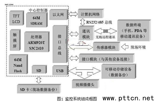基于arm 內(nèi)核的嵌入式系統(tǒng)在遠(yuǎn)程監(jiān)控報(bào)警系統(tǒng)中的設(shè)計(jì)實(shí)現(xiàn)與應(yīng)用。核心部分主要包 括 arm 嵌入式平臺(tái)設(shè)計(jì)及 μC-OS 嵌入式實(shí)時(shí)操作系統(tǒng)移植;人機(jī)交互界面 μCGUI 的設(shè)計(jì)與實(shí)現(xiàn);遠(yuǎn)程通 訊及自動(dòng)報(bào)警等;系統(tǒng)的設(shè)計(jì)還考慮到了擴(kuò)展性和通用性以及與其他監(jiān)控設(shè)備無(wú)縫連接等問(wèn)題。 1 引言 監(jiān)控系統(tǒng)現(xiàn)已成為現(xiàn)代化生產(chǎn)、生活中不可缺少的重要組成部分。目前,監(jiān)控系列產(chǎn)品 種類(lèi)繁多,大部分廣泛應(yīng)用于交通、醫(yī)院、銀行、家居、學(xué)校等安防領(lǐng)域。 隨著嵌入式系統(tǒng)的出現(xiàn),尤其是基于 arm 內(nèi)核芯片的嵌入式系統(tǒng)的出現(xiàn),使得監(jiān)控系統(tǒng)的應(yīng)用領(lǐng)域更為廣泛。本文設(shè)計(jì)的遠(yuǎn)程監(jiān)控報(bào)警系統(tǒng)除了作為安防功能外,還可以應(yīng)用于 以下領(lǐng)域:通訊領(lǐng)域:遠(yuǎn)程通訊、視頻會(huì)議和視頻點(diǎn)播、證券、遠(yuǎn)程教育等。醫(yī)療領(lǐng)域:病 房監(jiān)護(hù)、遠(yuǎn)程診斷等。工業(yè)領(lǐng)域:遠(yuǎn)程設(shè)備診斷、維護(hù)、維修,遠(yuǎn)程生產(chǎn)監(jiān)控等。家用領(lǐng)域:家用電器遠(yuǎn)程維護(hù);電、氣、火等重大事故自動(dòng)報(bào)警等。 2 系統(tǒng)設(shè)計(jì) 2.1系統(tǒng)組成 本文設(shè)計(jì)的遠(yuǎn)程監(jiān)控系統(tǒng)主要由中心控制器、數(shù)據(jù)終端、傳感器模塊、通訊模塊、接口模塊等幾部分組成。系統(tǒng)組成圖(如圖 1)。