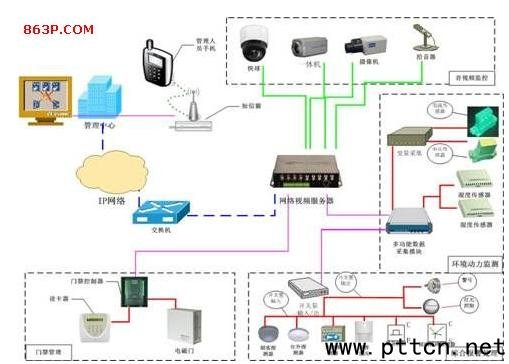 一、引言 無人值守機房環(huán)境動力監(jiān)控系統(tǒng)主要是對機房設(shè)備(如供配電系統(tǒng)、UPS電源、空調(diào)、消防系統(tǒng)、保安門禁系統(tǒng)等)的運行狀態(tài),設(shè)備運行的環(huán)境動力狀態(tài)等進行實時監(jiān)控并記錄歷史數(shù)據(jù),實現(xiàn)對機房五遙(遙測、遙信、遙控、遙調(diào),遙視)的管理功能,使機房監(jiān)控達到無人或少人值守,為機房高效的管理和安全運營提供有力的保證。 傳統(tǒng)的視頻監(jiān)控系統(tǒng)受技術(shù)發(fā)展的局限,只能進行現(xiàn)場監(jiān)視,簡單的報警信息傳輸,不能遠距離傳輸視頻信號?v觀市場,各安防廠家紛紛推出基于TCP/IP網(wǎng)絡(luò)的機房環(huán)境及動力監(jiān)控系統(tǒng)。其中基于網(wǎng)絡(luò)視頻服務(wù)器的機房環(huán)境監(jiān)控系統(tǒng)將是無人值守機房監(jiān)控系統(tǒng)的發(fā)展方向,下文將向讀者介紹它的系統(tǒng)組成與實現(xiàn)以及功能特色。 二、系統(tǒng)組成與實現(xiàn) 基于網(wǎng)絡(luò)視頻服務(wù)器的無人值守機房環(huán)境監(jiān)控系統(tǒng)按級別可分為前端機房監(jiān)控現(xiàn)場和后臺監(jiān)控中心兩大部分(如圖二)。 按功能共分三個部分:前端信號采集處理部分、信號傳輸部分、后臺控制(監(jiān)控中心)部分。 前端信號采集處理部分 在機房內(nèi)設(shè)置球機以觀察整個機房的總體狀況,在大門出入口和樓道處設(shè)置半球置攝像機以觀察整個通道人員的進出情況,并根據(jù)需要安裝,溫濕度探測器、電壓電流探測器等環(huán)境動力采集設(shè)備。 部分監(jiān)控現(xiàn)場安裝煙感探測器、紅外報警等探測器、周界報警裝置等。 信號傳輸部分 通常從前端監(jiān)控點到監(jiān)控中心都有2Mbps的E1通道,將視頻服務(wù)器通過E1專網(wǎng)把圖像及相關(guān)環(huán)境動力監(jiān)控數(shù)據(jù)傳送到監(jiān)控中心。 后臺控制(監(jiān)控中心)部分 在監(jiān)控中心配置一臺中心監(jiān)控服務(wù)器,負責(zé)管理前端所有攝像機、視頻服務(wù)器、環(huán)境動力監(jiān)測、報警設(shè)備,并聯(lián)動報警錄像、電子地圖等,同時管理后端所有上網(wǎng)監(jiān)控用戶。 三、系統(tǒng)示意圖