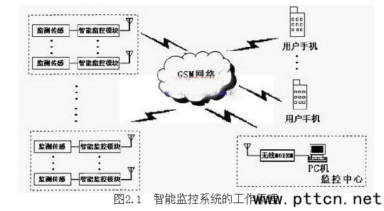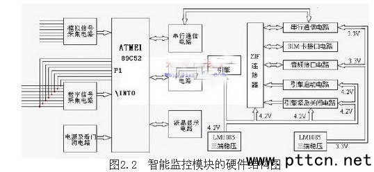主頁(http://www.130131.com):基于GSM的無線智能監(jiān)控設計 1 引言 2 智能監(jiān)控系統(tǒng)總體設計 智能模塊采用89C52微控制器并結合外圍電路實現(xiàn)對8路模擬量和8路數(shù)字量的數(shù)據(jù)采集和監(jiān)控,模擬信號經ADC0809模數(shù)轉換并被微控制器處理,若監(jiān)控對象正常則繼續(xù)循環(huán)監(jiān)測,若出現(xiàn)問題,微控制器即通過AT命令采用RS-232異步串行接口與無線MODEM通信并控制無線MODEM發(fā)送短信息給監(jiān)控者或監(jiān)控中心。如果情況緊急,微控制器會通過AT命令控制無線MODEM拔打監(jiān)控者的電話并同時播放預存在語音芯片ISD25120的語音信息作為報警信號。監(jiān)控者也可用短信息的命令形式去設置以微控制器為核心的智能模塊,以及發(fā)送短消息查詢命令查詢其監(jiān)控情況,從而達到無線監(jiān)控的目的。利用89C52的外部中斷功能對外界的8路數(shù)字輸入量的突發(fā)事件進行監(jiān)測,如果發(fā)生突發(fā)事件,中斷源立即產生中斷,89C52就會執(zhí)行相應的報警程序。報警信息以AT命令的形式寫入TC35I并通過短消息發(fā)送到監(jiān)控者手機上,對于特別緊急的事件可以直接撥打報警電話,因為短消息的發(fā)送有可能會延遲。為了確保監(jiān)控系統(tǒng)的可靠性,應在發(fā)送完短消息報警后再通過無線模塊給監(jiān)控者撥打電話,并由89C52控制ISD25120型語音電路播放預先存儲在語音電路的報警語音,同時在HD44780兼容的液晶顯示器上顯示出八路數(shù)字量和八路模擬量的監(jiān)控狀態(tài)。