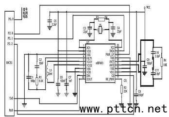 圖2:信號(hào)檢測(cè)電路 在定時(shí)周期Tx內(nèi),BISS0001的輸出端2為高電位,則晶體管VT1飽和導(dǎo)通,其集電極為低電位,將這一信號(hào)送到由單片機(jī)及無(wú)線發(fā)射電路組成的編碼及無(wú)線發(fā)射電路,接到編碼用的單片機(jī)的P0.0口,單片機(jī)將該探頭編碼后通過(guò)無(wú)線發(fā)射;在Tx結(jié)束時(shí),BISS0001進(jìn)入封鎖周期Ti,其輸出端變?yōu)榈碗娖剑w管截止,其集電極為高電平。BISS0001的1腳(A端)與電源相連,使信號(hào)檢測(cè)電路處于重復(fù)觸發(fā)。Tx定時(shí)間隔可由BISS0001的3腳和4腳上所接的電阻和電容來(lái)確定。信號(hào)檢測(cè)探頭仰角可在120°范圍內(nèi)調(diào)節(jié),并通過(guò)改變仰角來(lái)進(jìn)行實(shí)際探測(cè)距離的調(diào)節(jié),我們可通過(guò)實(shí)際測(cè)試來(lái)調(diào)整,也可以調(diào)整信號(hào)檢測(cè)電路中的可調(diào)電阻RP來(lái)調(diào)整探頭的檢測(cè)距離,本設(shè)計(jì)電路可探測(cè)距離為30m。 編碼電路與無(wú)線收發(fā)射模塊 本設(shè)計(jì)中采用挪威Nordic公司新推出的集發(fā)射接收為一體的nRF401無(wú)線數(shù)傳芯片,它是一個(gè)為433MHzISM頻段設(shè)計(jì)的真正單片機(jī)UHF無(wú)線收發(fā)芯片,采用FSK調(diào)制解調(diào)技術(shù)。采用高增益天線的情況下傳輸距離可達(dá)3000m。 編碼及無(wú)線收發(fā)射電路如圖3所示。通過(guò)AT89C51的P2.0口控制射頻芯片的PWR_UP,使其為“1”時(shí)表示進(jìn)入正常工作模式,為“0”時(shí)表示進(jìn)入待機(jī)模式;P2.2接射頻芯片的CS,控制發(fā)送接收頻率,為“1”表示工作頻率為434.32MHz。為“0”表示工作頻率為433.92MHz。P2.1控制射頻芯片的TXEN端,使其為“1”表示進(jìn)入發(fā)送模式,為“0”表示進(jìn)入接收模式。
