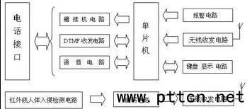 主頁(yè)(http://www.130131.com):基于熱釋電紅外傳感器的無(wú)線監(jiān)控報(bào)警 本設(shè)計(jì)旨在制作出一種功能強(qiáng)大的報(bào)警系統(tǒng),在出現(xiàn)緊急情況時(shí)能及時(shí)通知當(dāng)事人,即便其不在現(xiàn)場(chǎng)附近,并自動(dòng)呼叫報(bào)警。相比普通的報(bào)警器,本設(shè)計(jì)將重點(diǎn)放在遠(yuǎn)程語(yǔ)音報(bào)警上,只要接上適當(dāng)?shù)膫鞲衅骶涂山M成防盜報(bào)警、火災(zāi)報(bào)警、煤氣泄露報(bào)警等多功能報(bào)警系統(tǒng),并附加實(shí)現(xiàn)一些智能控制功能,賦予報(bào)警系統(tǒng)更強(qiáng)大和完整的功能,以滿足人們對(duì)安全報(bào)警的需求。本系統(tǒng)基于電話網(wǎng)絡(luò)但是與電話互相獨(dú)立不會(huì)影響電話的正常使用,并通過(guò)語(yǔ)音提示操作,人機(jī)交互友好。 本系統(tǒng)主要包括電話自動(dòng)摘機(jī)和掛機(jī)電路,DTMF信號(hào)收發(fā)電路,語(yǔ)音提示電路,報(bào)警電路,鍵盤(pán)顯示電路,人體信號(hào)檢測(cè)電路,編碼電路,無(wú)線發(fā)射電路,以及作為主核心的單片機(jī)控制電路,系統(tǒng)結(jié)構(gòu)框圖如圖1所示。我們?cè)O(shè)定報(bào)警部分為本系統(tǒng)主體工作部分,即實(shí)時(shí)監(jiān)控房?jī)?nèi)安全情況,在軟件上表現(xiàn)為主循環(huán),當(dāng)有振鈴信號(hào)或設(shè)定信號(hào)時(shí)才中斷去執(zhí)行相應(yīng)操作。在此我們需要對(duì)人體的紅外輻射敏感并且抗干擾(如小動(dòng)物等)的傳感器,為此我們選用被動(dòng)式熱釋電紅外探測(cè)器,并在它的輻射照面覆蓋特殊的菲尼爾濾光片,使環(huán)境的干擾受到明顯的控制作用。設(shè)定部分的功能是存儲(chǔ)報(bào)警時(shí)需要撥打的號(hào)碼,并設(shè)定主人身份驗(yàn)證密碼。為了系統(tǒng)的簡(jiǎn)潔采用液晶屏顯示。