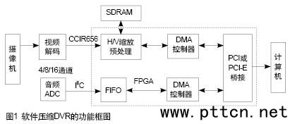 隨著信息社會(huì)的發(fā)展,人們的安全意識(shí)在不斷增強(qiáng),對(duì)安防監(jiān)控設(shè)備的需求也在持續(xù)增長(zhǎng)?偟目磥,安防視頻監(jiān)控技術(shù)的發(fā)展趨勢(shì)為:新的H.264壓縮技術(shù)可以增加硬盤的存儲(chǔ)時(shí)間,并減少對(duì)網(wǎng)絡(luò)帶寬的需求,因而逐漸成為主流;高清晰度視頻系統(tǒng)開始出現(xiàn)在一些高端應(yīng)用場(chǎng)合,并將逐步擴(kuò)展到中、低端應(yīng)用;PCI Express(簡(jiǎn)稱PCI-E)正在取代傳統(tǒng)的PCI總線,從而使目前流行的PCI總線壓縮卡將轉(zhuǎn)換到PCI Express總線架構(gòu);隨著IP網(wǎng)絡(luò)的普及,基于IP網(wǎng)絡(luò)視頻監(jiān)控系統(tǒng)增長(zhǎng)迅速,并積極向智能化發(fā)展。 顯然,安防視頻監(jiān)控技術(shù)的這種發(fā)展,其產(chǎn)品都要求有更高性能和更靈活性的器件來構(gòu)建,而單純采用DSP處理器或現(xiàn)成芯片(ASSP)的方法己難以滿足系統(tǒng)的需求。由于目前可編程器件具有很高的集成度和靈活性,以及低功耗和寬的工作范圍,且其價(jià)格又不斷下降,因此利用可編程邏輯門陣列(FPGA)特有的高性能和靈活性,使其成為許多視頻監(jiān)控產(chǎn)品的理想選擇。筆者將陸續(xù)介紹,應(yīng)用FPGA器件構(gòu)建一些典型的視頻監(jiān)控產(chǎn)品的方案,如軟壓縮DVR卡、硬壓縮多通道DVR系統(tǒng)、智能網(wǎng)絡(luò)DVR與DVS,以及智能網(wǎng)絡(luò)攝像機(jī)的實(shí)現(xiàn)方案等。這里介紹構(gòu)建智能網(wǎng)絡(luò)DVR的實(shí)現(xiàn)方案。 DVR技術(shù)的發(fā)展是與計(jì)算機(jī)技術(shù)的發(fā)展密不可分的,圖像處理是一個(gè)大數(shù)據(jù)流的傳輸過程,它在硬件方面受到計(jì)算機(jī)的計(jì)算速度、存儲(chǔ)器的容量及動(dòng)態(tài)分布、多CPU或計(jì)算機(jī)網(wǎng)絡(luò)設(shè)計(jì)、數(shù)據(jù)總線、網(wǎng)絡(luò)傳輸帶寬的限制;在軟件方面,也受到如數(shù)據(jù)總線流模式、數(shù)據(jù)塊傳輸協(xié)議、數(shù)據(jù)壓縮算法、模式識(shí)別算法等限制。 DVR系統(tǒng)擁有多路視頻輸入(典型的為4路、8路或16路等),而且都已包含了原來的畫面分割器和多路復(fù)用器的功能。使用網(wǎng)絡(luò)DVR的模擬監(jiān)控系統(tǒng),是一個(gè)部分?jǐn)?shù)字化的系統(tǒng),它包括一個(gè)網(wǎng)絡(luò)DVR設(shè)備,該網(wǎng)絡(luò)DVR配有用于網(wǎng)絡(luò)連接的以太網(wǎng)接口。視頻信號(hào)在DVR中轉(zhuǎn)換為數(shù)字信號(hào)并被壓縮,然后通過計(jì)算機(jī)網(wǎng)絡(luò)進(jìn)行傳輸,在遠(yuǎn)端通過電腦便可進(jìn)行監(jiān)控。基于DVR的數(shù)字化網(wǎng)絡(luò)系統(tǒng),突破了以往傳統(tǒng)的數(shù)字硬盤錄像機(jī)、模擬矩陣、攝像機(jī)等獨(dú)霸天下的局面。 智能網(wǎng)絡(luò)DVR系統(tǒng),其首要的優(yōu)勢(shì)是數(shù)字化和壓縮的過程都在本地完成,此時(shí)可通過已連入互聯(lián)網(wǎng)的現(xiàn)有網(wǎng)絡(luò)設(shè)備來傳輸智能數(shù)據(jù),從而可有效降低使用成本。因?yàn),僅有通過所嵌入的智能功能所識(shí)別出的帶預(yù)/報(bào)警信息觸發(fā)的視頻數(shù)據(jù),才會(huì)被發(fā)送到中央監(jiān)控站,以用于進(jìn)一步地分析并采取進(jìn)一步的響應(yīng),以降低網(wǎng)絡(luò)設(shè)備的負(fù)載并減少人為錯(cuò)誤。 在智能網(wǎng)絡(luò)DVR系靳中,由于新增加了一些智能功能的圖像分析與識(shí)別、智能搜索引擎、智能尋像、多媒體指揮平臺(tái)等高效實(shí)用的功能,使它作為一種獨(dú)立的產(chǎn)品形態(tài),已逐漸進(jìn)入了人們的視野。在數(shù)字硬盤錄像機(jī)DVR領(lǐng)域中,有軟壓縮與硬壓縮兩種方式。本文簡(jiǎn)要介紹,應(yīng)用FPGA構(gòu)建軟壓縮DVR卡、硬壓縮多通道DVR系統(tǒng)方案的組成、原理,以及智能網(wǎng)絡(luò)DVR可具備的智能功能及其實(shí)現(xiàn)方案。 軟壓縮DVR方案 軟壓縮DVR的功能非常適合用FPGA器件來實(shí)現(xiàn),圖1所示即為一個(gè)用FPGA器件來實(shí)現(xiàn)軟件壓縮DVR的功能框圖。