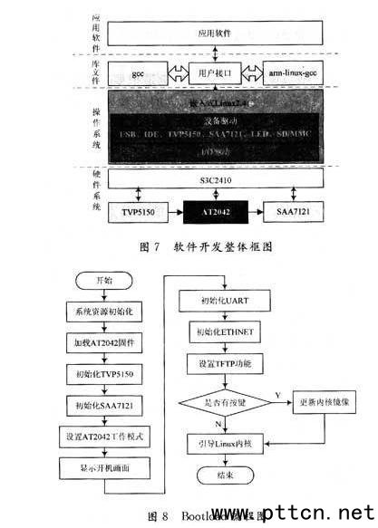 2.1 系統(tǒng)啟動Bootloader程序設計編寫 Bootloader是系統(tǒng)啟動時執(zhí)行的第一個程序,其主要完成對硬件系統(tǒng)的初始化。具體包括:S3C2410的初始化、TVP5150功能配置、 SAA7121功能配置、加載AT2042固件、以太網(wǎng)及串口初始化。由于在開機時要顯示開機畫面,故除在Bootloader中初始化相應硬件資源外,還應將開機畫面的圖片數(shù)據(jù),傳送到AT2042SDRAM中。Bootloader整體流程圖如圖8所示。