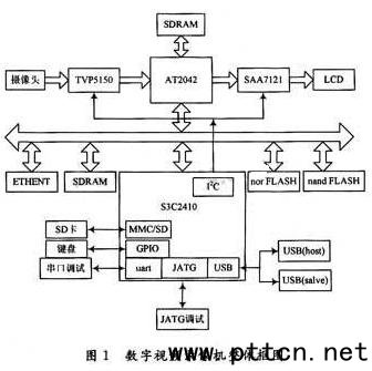 1 數(shù)字視頻錄像機的硬件設計 在基于S3C2410與AT2042的數(shù)字視頻錄像機的設計和實現(xiàn)中,其終端設備以Samsung公司的32位處理器S3C2410為主控處理器,利用Pentamicro公司的AT2042芯片完成雙通道視頻編碼與解碼,其視頻錄像功能具有高分辨率和高質(zhì)量。本文將介紹此終端的系統(tǒng)整體設計,并詳細分析系統(tǒng)軟硬件設計,最后給出測試結果和結論。根據(jù)市場的需求,本系統(tǒng)預計實現(xiàn)下列幾項指標: (1)實現(xiàn)對視頻數(shù)據(jù)的MPEG-4標準的編解碼; (2)編解碼像素為720X576像素點,實現(xiàn)25 f/s; (3)實現(xiàn)JPEG編碼和解碼; (4)實現(xiàn)USB/SD卡儲存。 1.1 基于S3C2410與AT2042的數(shù)字視頻錄像機整體設計 該系統(tǒng)主要依靠AT2042的編解碼功能,系統(tǒng)的硬件框圖如圖1所示,它主要由視頻編碼子系統(tǒng)、主控系統(tǒng)、數(shù)據(jù)處理子系統(tǒng)和視頻解碼子系統(tǒng)4大部分構成。