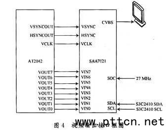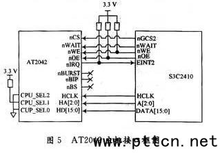 現(xiàn)在的數(shù)字電視視頻接口還沒有實現(xiàn)統(tǒng)一的工業(yè)標準,故在視頻輸出端設計時,仍使用現(xiàn)在比較流行的A/V接口或S-video接口。由于上述2種接口傳輸?shù)臑槟M電視信號,故在AT2042的視頻輸出端口需要增加一級處理,即將數(shù)字信號轉化為模擬電視信號。在后端設計中選用SAA7121,它是一款專用的電視信號編碼芯片,可以將輸入的數(shù)字信號經(jīng)過內(nèi)部的D/A轉化為適于傳輸?shù)哪M電視信號,通過配置相應的寄存器可以輸出滿足S-video接口或復用接口的信號。 1.3 AT2042的主機接口 主控CPU(S3C2410)和AT2042是數(shù)字視頻錄像機的核心處理芯片,S3C2410控制整個數(shù)字視頻錄像機系統(tǒng)的運行,AT2042除完成對視頻信號的硬件壓縮編碼外,還可對壓縮后的視頻數(shù)據(jù)進行硬件解壓縮。AT2042壓縮編碼后的視頻數(shù)據(jù)通過芯片內(nèi)部集成的Mux FIFO接口輸出后,外部主CPU負責對其進行USB存儲器處理,處理后的視頻數(shù)據(jù)可以存儲在物理介質(zhì)上,以便在需要時通過鍵盤操作進行回放。 圖5為S3C2410與AT2042接口框圖。