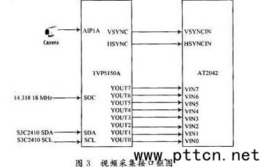 攝像頭采集輸出信號為NTSC,PAL或SECAM制式的電視信號,必須經(jīng)過視頻解碼處理才能轉化成適合AT2042進行編碼的數(shù)字信號。 TVP5150是TI公司生產(chǎn)的一款電視信號解碼專用芯片,它對輸入的模擬信號進行A/D轉化,通過設置相應的寄存器可以使輸出信號滿足RGB格式或 YUV422格式。由于在本系統(tǒng)中AT2042視頻接口滿足ITU.RBT656標準,故TVP5150輸出配置為8位YUV422格式。 視頻輸出如圖4所示。