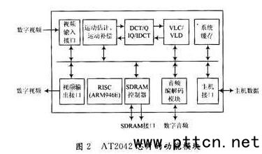 韓國Pentamicro公司生產(chǎn)的AT2042芯片的功能模塊如圖2所示,AT2042是一個內(nèi)置微控制器ARM946E的2通道音視頻編解碼 (A/VCODEC)芯片,主要完成對視頻和語音數(shù)據(jù)的編碼和解碼,支持多種音視頻編解碼標準,可直接與IBM,Motorola,ARM,XscaIe 和Axis等多種CPU接口,無需其他附加電路。