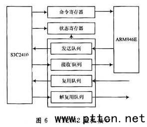 AT2042的CPU_SEL[2:0]是主控CPU選擇引腳,經(jīng)配置這幾個引腳的高低電平,使AT2042可選擇主控CPU,CPU_SEL[2:0]為010選擇ARM結構芯片; nCS,nWAIT等為總線控制信號線; HCLK是AT2042主機接口的工作時鐘,一般要求工作在50 MHz,當S3C2410在復位后設置FCLK為200MHz,HCLK為100 MHz,PCLK為50 MHz。故將S3C2410的PCLK引腳與AT2042的HCLK引腳相連。 通過這種機制,S3C2410可以實現(xiàn)簡單的訪問AT2042。 AT2042與CPU的通信機制如圖6所示,CPU對AT2042的控制和訪問主要通過AT2042的2個寄存器(status register和command register)和4個FIFO(Tx FIFO,Rx FIFO,Multiplex FIFO和De-Multiplex FIFO)完成。