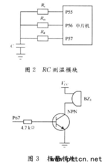 1.2 系統(tǒng)的主要功能 設(shè)計主要實(shí)現(xiàn)的功能是及時檢測電腦CPU的溫度,當(dāng)溫度達(dá)到報警溫度時則報警,同時檢測并顯示風(fēng)扇轉(zhuǎn)速,當(dāng)風(fēng)扇不工作或工作出現(xiàn)故障時都可及時地從轉(zhuǎn)速發(fā)現(xiàn)問題。另外,可顯示真實(shí)時間或電腦工作時間,以確定電腦工作壽命. 2 系統(tǒng)硬件設(shè)計 系統(tǒng)硬件電路部分包括:EM78P468單片機(jī)、按鍵模塊、風(fēng)扇測速模塊、測溫模塊、顯示模塊、報警模塊。 2.1 EM78P468單片機(jī) EM78P468是采用低功耗高速CMOS工藝設(shè)計開發(fā)出來的8位單片機(jī)。其內(nèi)部有4K×13位一次性編程ROM,集成了看門狗,RAM,可編程時鐘計數(shù)器,內(nèi)部和外部的中斷,掉電模式,LCD驅(qū)動,紅外發(fā)射功能,三態(tài)雙向I/O口;并且提供程序保護(hù)位來防止寫入的程序被他人非法讀出。其芯片為64引腳封裝,工作電壓為2.2~5.5 V,工作溫度在0~70℃之間。 2.2 RC測溫模塊 RC測溫模塊實(shí)際上是通過標(biāo)準(zhǔn)電阻和待測熱敏電阻的比例關(guān)系來求出當(dāng)前溫度。它的電路圖如圖3所示。電路由單片機(jī)和電阻Rs,Rm,Rd及電容C組成。在圖2中,Rs是標(biāo)準(zhǔn)電阻,用于校正和定標(biāo);Rm是被檢測的熱敏電阻;Rd是一個限流電阻,為了使充電電流能保證單片機(jī)不會損壞,Rd一般取500 Ω左右?梢詼y出標(biāo)定電阻和熱敏電阻的放電時間分別為ts。,tm,從而Rm=tmRs/ts。再根據(jù)熱敏電阻的分度表查出對應(yīng)的溫度。