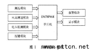 引 言 在計算機(jī)技術(shù)逐漸滲入社會生活各個層面的今天,使用計算機(jī)的人越來越多。在這些人群當(dāng)中,有很大一部分對電腦硬件并不熟悉,或不懂得維護(hù)。在此設(shè)計一個電腦監(jiān)控器,它的功能是及時反映出電腦主機(jī)內(nèi)部CPU溫度及風(fēng)扇運(yùn)轉(zhuǎn)情況等,可及時有效地對電腦進(jìn)行維護(hù)。 1 系統(tǒng)組成及功能 1.1 系統(tǒng)的構(gòu)成 電腦監(jiān)視器由EM78P468單片機(jī)、按鍵模塊、風(fēng)扇測速模塊、測溫模塊、顯示模塊、報警模塊等組成,其系統(tǒng)總體結(jié)構(gòu)框圖如圖1所示。