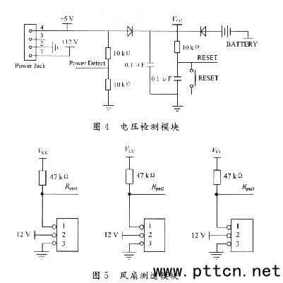 2.5 風(fēng)扇測速模塊 風(fēng)扇測速模塊如圖5所示。系統(tǒng)的三路風(fēng)扇分別接到三路風(fēng)扇插座上面,每路風(fēng)扇都由12 V電源供電;每路風(fēng)扇插座的1號端口由VCC(5 V)供電,并通過Rpm接到I/O端口上。當(dāng)風(fēng)扇正常工作的時候,會在每個插座的1號端口輸出一系列周期為毫秒級的方波,這樣只要測出相應(yīng)的I/O端口單位時間(1 s)內(nèi)的方波個數(shù),就可以計算出風(fēng)扇轉(zhuǎn)速。