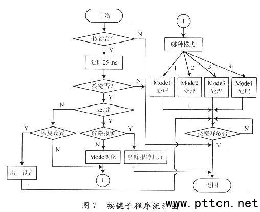 3 系統(tǒng)軟件設(shè)計 3.1 主程序流程圖 系統(tǒng)軟件采用匯編語言編寫,程序主要流程圖如圖6所示。系統(tǒng)程序主要包括了初始化、按鍵子程序、A/D轉(zhuǎn)換子程序、報警子程序、風(fēng)扇測速子程序、工作時鐘子程序、顯示子程序、真實(shí)時鐘子程序總共8個模塊,共同作用完成本系統(tǒng)所要實(shí)現(xiàn)的功能。在本系統(tǒng)當(dāng)中,雖然按鍵僅只有“set”鍵、“up''鍵和“down”鍵3個,但這是設(shè)計中的一個難點(diǎn)。下面重點(diǎn)介紹按鍵子程序。 3.2 按鍵子程序 3.2.1 按鍵要求實(shí)現(xiàn)的功能 (1)溫度顯示單位℃/°F的切換:在初始狀態(tài)下,按“up"鍵可以切換溫度的顯示單位。 (2)CPU報警溫度的設(shè)定:在初始狀態(tài)下,按“set”鍵,溫度顯示由實(shí)際溫度轉(zhuǎn)換為報警溫度(預(yù)設(shè)值為60℃&140°F)。此時,按“up"或"down"鍵可以設(shè)定報警溫度,設(shè)定完后按“set”鍵鎖定進(jìn)入時間設(shè)定界面;當(dāng)溫度達(dá)到報警溫度時,蜂鳴器開始報警,直到按一下“set”鍵后,方才能解除報警。 (3)時間設(shè)定:在初始狀態(tài)下按“set”鍵,溫度顯示由實(shí)際溫度轉(zhuǎn)換為報警溫度(預(yù)設(shè)值為60 ℃&140 °F),再壓“set”鍵將進(jìn)入時間設(shè)定界面,按“up"或“down”鍵可以調(diào)整時針的整數(shù)值,調(diào)整完時針之后再按“set”鍵鎖定并進(jìn)入分針的設(shè)定模式,同樣按“up"或“down”鍵就可以調(diào)整它的值了,按“set"鍵鎖定。 (4)真實(shí)時間和工作時間的轉(zhuǎn)換:在初始狀態(tài)下按“down”鍵可以切換時間模式的顯示,累計工作時間在24 h之內(nèi)顯示單位為時/分,超過24 h就顯示為天。 (5)LCD Reset:同時按住“up"和“down”鍵約2 s,LCD將復(fù)位,所有值將回到出廠設(shè)置狀態(tài)。 3.2.2 按鍵子程序流程圖 通過上面的按鍵功能的描述,可以把按鍵子程序理解成為可以通過“set”鍵調(diào)整狀態(tài),然后每個狀態(tài)下又有各自的子狀態(tài),這些子狀態(tài)可以通過“up”或者“down”鍵來進(jìn)行調(diào)整;最后還有2個特殊狀態(tài),解除警報和LCD復(fù)位。按鍵子程序流程如圖7所示。
