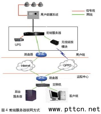 數(shù)據(jù)聯(lián)網(wǎng)總線連接方式 第一種,前端服務(wù)器聯(lián)網(wǎng)方式(見圖4)。這是目前數(shù)據(jù)聯(lián)網(wǎng)采用比較多的方式,即在用戶端安裝一個前端服務(wù)器,主要承擔(dān)將用戶數(shù)據(jù)系統(tǒng)的控制、報警、狀態(tài)信息解析成后臺的標(biāo)準(zhǔn)信息格式發(fā)送給后臺服務(wù)器,同時由后臺服務(wù)器發(fā)出的控制命令通過前端服務(wù)器解析成用戶數(shù)據(jù)系統(tǒng)能接受的信息格式發(fā)送到用戶數(shù)據(jù)系統(tǒng)。