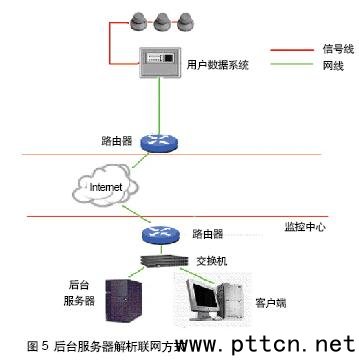 第二種,后臺服務(wù)器解析聯(lián)網(wǎng)方式(見圖5)。后臺服務(wù)器解析聯(lián)網(wǎng)方式是將用戶數(shù)據(jù)系統(tǒng)的協(xié)議解析由后臺服務(wù)器承擔(dān),這樣可以省去了前端服務(wù)器,降低了聯(lián)網(wǎng)成本。