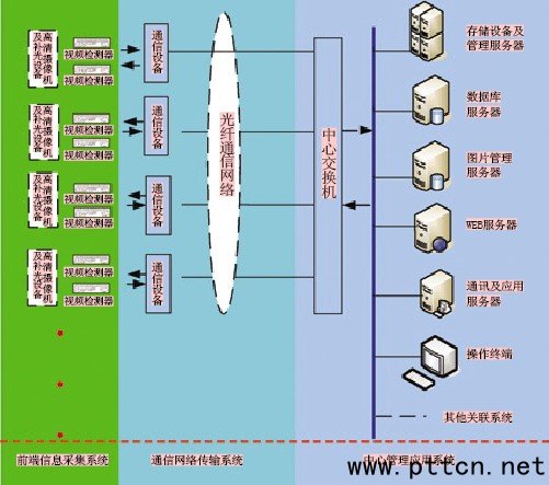 圖1 典型的車牌識別系統(tǒng)示意圖 車牌定位,車牌切分,二值化和最終的字符識別等。此外,成熟的算法一般還有傾斜校正、陰影處理等特殊處理技術(shù)。新一代的車牌識別系統(tǒng)還引入了目標跟蹤技術(shù)以抓拍非機動車和行人等目標,并且引入顏色識別技術(shù)、車型識別技術(shù)、車標識別技術(shù)等。 典型應(yīng)用 1、前端信息采集系統(tǒng) 高清車牌識別系統(tǒng)對運動狀態(tài)的目標不但要有高速圖像捕獲率,還必須要抓拍到清晰的圖像(車牌、前排司乘人員、行人),作為事后查詢、特征搜索和取證的重要依據(jù)。為此,采用200萬像素的高清晰攝像機和配套的高清鏡頭(能滿足200萬像素高清晰攝像機要求的鏡頭),一臺高清晰攝像機可抓拍兩個機動車道的車輛并兼顧相鄰車道的交叉,同時提供全景照片,徹底解決跨線漏車問題,清楚記錄車輛圖像,同時還可以清晰地顯示前排司乘人員的面貌和行人特征,充分體現(xiàn)高清系統(tǒng)的優(yōu)勢。
