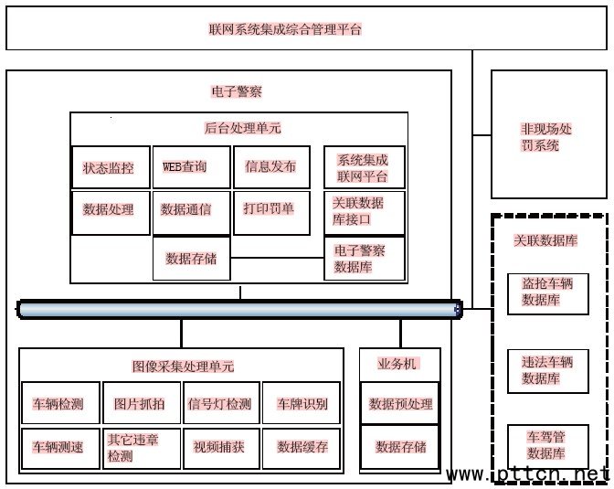 圖3 治安卡口系統(tǒng)結(jié)構(gòu)框圖 2、違章闖紅燈抓拍系統(tǒng)