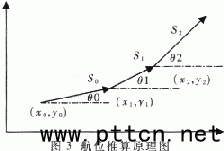 GPS車輛監(jiān)控系統(tǒng)的車載設(shè)備包括定位裝置、數(shù)據(jù)傳輸裝置、控制電路、電源、顯示、短信息輸入、語(yǔ)音接口等,其功能主要是傳輸車輛的位置、時(shí)間、速度、狀態(tài)(短信息)、車號(hào)、路號(hào),并提示司機(jī)與區(qū)調(diào)中心進(jìn)行通話聯(lián)系以及顯示快慢點(diǎn)或時(shí)鐘。不同的車輛采取時(shí)分多路(Time Divided Multi-AddressmTDNA)的方式,每一車載設(shè)備分配一個(gè)固定的時(shí)隙,而各車輛的同步利用區(qū)調(diào)中心的廣播同步碼來(lái)進(jìn)行。設(shè)備組成如圖2所示。 定位裝置采用DGPS(Differential Global Positioning System)和INU(Initial Navigating Unit)組合的方法。DGPS的精度能夠達(dá)到±10m,由車載設(shè)備接收區(qū)調(diào)的差分信息寫入GPS接收機(jī)實(shí)現(xiàn)。INU(此處為角速度傳感器和汽車?yán)锍虄x)的信號(hào)能夠保證定位的連續(xù)性,使得GPS接收機(jī)因衛(wèi)星跟蹤不到或衛(wèi)星數(shù)不夠時(shí)系統(tǒng)仍能定位。GPS接收機(jī)和INU的工作完全是自動(dòng)切換,利用INU進(jìn)行航位推算以GPS的定位數(shù)據(jù)作為起始位置。航位推算的基本原理如圖3所示。