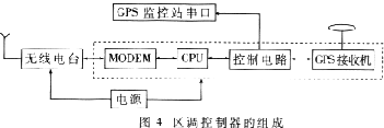 3 區(qū)調(diào)控制器的構(gòu)成 區(qū)調(diào)控制器在整個(gè)系統(tǒng)中主要完成車輛信息的接收及上行傳輸、差分?jǐn)?shù)據(jù)及調(diào)度命令的下發(fā)、廣播同步信號(hào)的下發(fā)等。其組成如圖4所示。 區(qū)調(diào)控制器由MODEM、CPU、GPS接收機(jī)、控制電路組成,MODEM實(shí)現(xiàn)數(shù)字信號(hào)和模擬信號(hào)的相互轉(zhuǎn)換,控制電路提供嚴(yán)格的時(shí)序和相關(guān)