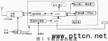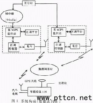 1 GPS車輛監(jiān)控系統(tǒng)的構(gòu)成 GPS車輛監(jiān)控系統(tǒng)的系統(tǒng)構(gòu)成見(jiàn)圖1,共分4部分:GPS差分站、GPS監(jiān)控站、區(qū)調(diào)控制器、車載設(shè)備,集群網(wǎng)的基站、復(fù)用器、區(qū)調(diào)平臺(tái)都是和GPS系統(tǒng)相關(guān)、用于實(shí)現(xiàn)數(shù)據(jù)傳輸及其它輔助功能的內(nèi)容。系統(tǒng)中的數(shù)據(jù)傳輸分兩部分,一是無(wú)線傳輸,一是有線傳輸。無(wú)線傳輸是利用MOTOROLA公司的SMARTNET-II+模擬集群網(wǎng)。有線傳輸利用幀中繼和計(jì)算機(jī)網(wǎng)絡(luò)實(shí)現(xiàn),其中差分?jǐn)?shù)據(jù)的傳輸利用RS485串行口和專用的9.6kHz幀中繼帶寬完成;車輛信息上行傳輸?shù)絽^(qū)調(diào)平臺(tái)以及調(diào)度命令下行到GPS監(jiān)控站均由計(jì)算機(jī)網(wǎng)絡(luò)完成。 系統(tǒng)中基本的數(shù)據(jù)傳輸流向?yàn)椋翰罘中畔⒂刹罘终鞠掳l(fā),通過(guò)RS232串行口擴(kuò)展為485接口再傳輸?shù)絻蓚(gè)客運(yùn)中心(客三和客六),到客六的傳輸直接由485模塊到485模塊完成(距離約100m),到客三的傳輸利用幀中繼和485串行口來(lái)共同實(shí)現(xiàn)(距離約為5km)。存儲(chǔ)在GPS監(jiān)控站的差分信息由區(qū)調(diào)控制器定時(shí)來(lái)讀取下發(fā)到各運(yùn)營(yíng)車輛。車輛信息通過(guò)集群網(wǎng)傳輸?shù)絽^(qū)調(diào)中心,由區(qū)調(diào)控制器解調(diào)后傳送到GPS監(jiān)控站。調(diào)度平臺(tái)向各運(yùn)營(yíng)車輛下發(fā)調(diào)度命令是通過(guò)GPS監(jiān)控站進(jìn)行的,兩者之間的數(shù)據(jù)傳輸通過(guò)計(jì)算機(jī)網(wǎng)絡(luò)進(jìn)行。 2 車載設(shè)備的構(gòu)成