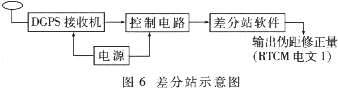 5 GPS差分站及其工作原理 該系統(tǒng)中的差分站工作于偽距差分模式,為整個(gè)北京地區(qū)的所有公交車(chē)輛提供偽距修正信息,使得定位精度比SA影響時(shí)提高一個(gè)數(shù)量級(jí)。其構(gòu)成如圖6所示。DGPS接收機(jī)的差分輸出信息經(jīng)過(guò)控制電路傳輸?shù)讲罘终竟芾砦C(jī),由差分站軟件讀取并經(jīng)RS232串行口(轉(zhuǎn)換為485)發(fā)送到兩個(gè)區(qū)調(diào)的GPS監(jiān)控站。 差分GPS的工作原理如下所述。 假定衛(wèi)星j發(fā)信號(hào)時(shí)的理想GPS時(shí)為tjg,接收機(jī)接收到該信號(hào)時(shí)的理想GPS時(shí)為tg,tj為衛(wèi)星j發(fā)信號(hào)時(shí)的衛(wèi)星鐘時(shí)刻,t為接收機(jī)收到信號(hào)時(shí)的接收機(jī)時(shí)刻。則衛(wèi)星鐘具有鐘差