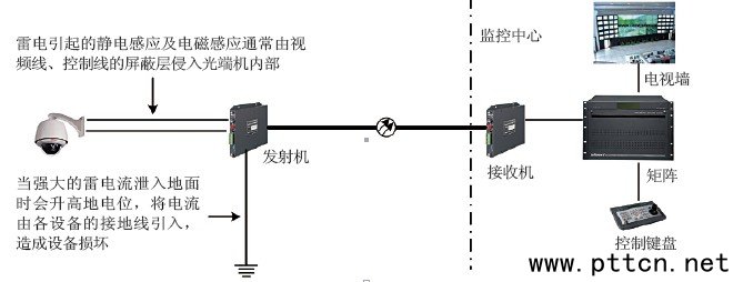 圖2 雷電破壞設(shè)備示意圖 雖然雷電的破壞形式多種多樣,但還是可以通過采取科學(xué)的防護(hù)措施來降低光端機(jī)故障發(fā)生幾率。首先,保證接地裝置效果良好是防雷措施的前提,因?yàn)樗懈袘?yīng)電流最后都是要泄入大地的。一般而言,接地電阻越小泄流效果越好,通常將接地電阻控制在4歐姆以內(nèi)為佳,可使用接地鉗表對接地電阻進(jìn)行測量。對于某些土壤電阻率高的地方,可以考慮在土壤中加入降阻劑,從而降低接地電阻。其次,前端設(shè)備要加裝浪涌保護(hù)器,正常電壓時(shí),浪涌保護(hù)器呈高阻狀態(tài),只有很小的泄漏電流,功率損耗很小,當(dāng)線路中出現(xiàn)過壓時(shí),浪涌保護(hù)器呈低阻狀態(tài),過電壓以放電電流的形式通過浪涌保護(hù)器流入大地,過電壓被抑制下來,浪涌電壓過后,線路電壓恢復(fù)正常時(shí),浪涌保護(hù)器又呈高阻絕緣狀態(tài),因此浪涌保護(hù)器必須有良好的接地裝置與之配合。前端攝像機(jī)的視頻信號(hào)輸出口和發(fā)射機(jī)的視頻輸入口處接浪涌保護(hù)器,若發(fā)射機(jī)連有其他一些數(shù)據(jù)線時(shí),需要在控制信號(hào)線的起始端和結(jié)束端加裝數(shù)據(jù)防雷器,并在攝像機(jī)和光端機(jī)的電源輸入端也加上電源防雷器等防雷設(shè)備。裝防雷器時(shí)務(wù)必使防雷器緊貼接入口,若防雷器距離視頻口、數(shù)據(jù)口太遠(yuǎn)是發(fā)揮不了防雷效果的。 加好防雷設(shè)備后,剩下的便是接地網(wǎng)的設(shè)計(jì)問題。接地樁一定要打到位,保證光端機(jī)良好接地,一個(gè)好的低阻抗接地網(wǎng)設(shè)計(jì)能夠保證系統(tǒng)中的防雷設(shè)備發(fā)揮良好效果且能有效均衡整個(gè)傳輸系統(tǒng)內(nèi)各部位電壓,防止地電位差對線路中設(shè)備的干擾,同時(shí)也可有效避免地電位反擊對設(shè)備的損壞。 光端機(jī)的調(diào)試 做好以上幾點(diǎn)后,就要開始正常的調(diào)試了,主要是對光纖和數(shù)據(jù)通道的調(diào)試。由于光端機(jī)數(shù)據(jù)的可選類型較多,根據(jù)現(xiàn)場的實(shí)際需求不同,現(xiàn)場使用的光端機(jī)數(shù)據(jù)類型也不盡相同,在調(diào)試時(shí)一定要參照相應(yīng)的說明書,按照說明書上的數(shù)據(jù)撥碼和接口定義來進(jìn)行數(shù)據(jù)接線。 由于光端機(jī)現(xiàn)場安裝的環(huán)境復(fù)雜,有些用戶在調(diào)試不通的情況下通常首先懷疑產(chǎn)品有故障,其實(shí)光端機(jī)產(chǎn)品技術(shù)已非常成熟,產(chǎn)品出廠前都經(jīng)過反復(fù)測試與拷機(jī),所以產(chǎn)品本身問題可能性較小,因此,在現(xiàn)場有問題時(shí)首先需要考慮的是安裝問題,可以從以下幾個(gè)方面去排查: ·光纖本身沒有經(jīng)過測試,光路不通或不穩(wěn)定或光衰減過大等; 以上現(xiàn)象尤其是線路故障發(fā)生的概率最大,在遇到問題時(shí)需要仔細(xì)檢查。排除故障時(shí),可以采用排除法,一個(gè)設(shè)備一個(gè)設(shè)備排除,最后準(zhǔn)確判斷問題關(guān)鍵所在。在判斷光端機(jī)是否有問題時(shí)建議用戶將發(fā)射機(jī)與接收機(jī)放在一起近距離測試,如若還不通,則為光端機(jī)本身故障,就需要跟廠家聯(lián)系調(diào)換了。為了減少問題,用戶盡可能在安裝前,近距離測試光端機(jī),這樣便能快速通過安裝與調(diào)試,節(jié)省工期。 光端機(jī)日常保養(yǎng) 通常狀況光端機(jī)的工作環(huán)境相當(dāng)惡劣,使用時(shí)要注意保持光纖頭的清潔。光端機(jī)對灰塵非常敏感,而由于光端機(jī)運(yùn)輸過程中或是客戶使用一段時(shí)間后,都有可能在光纖口處出現(xiàn)灰塵或雜物造成堵塞,從而影響視頻及數(shù)據(jù)的正常傳輸,此時(shí)可使用工業(yè)無水酒精和無塵紙對光纖頭進(jìn)行清洗,避免粘附灰塵。 光端機(jī)內(nèi)部的光纖跳線與外部光纖是通過適配器連接的,通常適配器為陶瓷管芯,在插拔光纖頭時(shí)要特別注意,切勿用力不當(dāng)以防將陶瓷套管擠裂或是壓碎,造成光端機(jī)無法正常傳輸信號(hào)。 結(jié)語 視頻光端機(jī)技術(shù)成熟,功能穩(wěn)定,成本低,是目前視頻遠(yuǎn)距離傳輸項(xiàng)目的首選,一些光端機(jī)廠商也通過技術(shù)革新,推出功能更為強(qiáng)大的光纖傳輸系統(tǒng)。隨著視頻監(jiān)控系統(tǒng)向網(wǎng)絡(luò)化、高清化發(fā)展,光端機(jī)廠商也會(huì)相應(yīng)推出新產(chǎn)品,使模擬視頻、網(wǎng)絡(luò)視頻的傳輸管理與圖像存儲(chǔ)功能綜合起來,提高光纖利用率。 (中國集群通信網(wǎng) | 責(zé)任編輯:陳曉亮) |