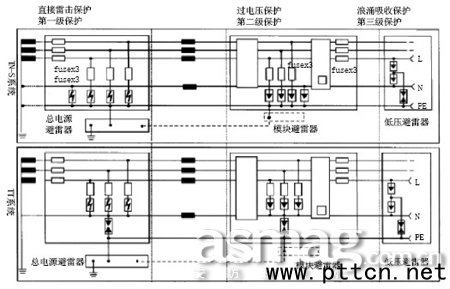主頁(http://www.130131.com):視頻監(jiān)控系統(tǒng)設(shè)備的防雷電措施與安裝(2) 2、建筑物內(nèi)部防雷技術(shù)措施 據(jù)統(tǒng)計,80%的雷擊事故是由于感應(yīng)雷(間接雷)或雷電侵入建筑物內(nèi)而引起的。內(nèi)部防雷技術(shù)措施可以抑制和吸收感應(yīng)雷的干擾。該技術(shù)措施有:等電位連接、屏蔽、合理布線、接地、濾波器、避雷器等。 電源系統(tǒng)防雷 經(jīng)過防雷分區(qū)后,電源線分為三級保護(hù)。 第一級電源防雷 第一級電源防雷的作用是防止直接雷擊和強的感應(yīng)雷。選擇第一級電源防雷器,可以采用間隙放電類型的大容量避雷器,一般要求雷電通流容量大于60kA(10/350測試波形),具備阻燃特性,在變態(tài)器低壓側(cè)(配電框)的每一條L、N線對地并聯(lián)安裝,可采用德國DEHN的總電源避雷器DEHNport,或一些性能較高的組合型避雷器箱,如威雷寶RAINBOW系列避雷器的ROWER-FR防雷箱。對于TN系統(tǒng)和TT系統(tǒng),避雷器的配置和安裝線路也有所區(qū)別(安裝線路圖如圖3所示)。