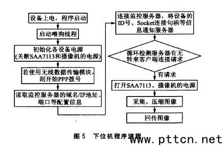 圖4中RS485的數(shù)據(jù)流方向由GPE13口的電平進(jìn)行控制。 2.系統(tǒng)軟件的設(shè)計(jì) 系統(tǒng)軟件包含下位機(jī)軟件、服務(wù)器軟件和客戶端軟件。下位機(jī)軟件部署在遠(yuǎn)程圖像監(jiān)控設(shè)備上。這個(gè)軟件作為一個(gè)Linux的守護(hù)進(jìn)程啟動(dòng),負(fù)責(zé)壓縮采樣到的圖像數(shù)據(jù),并把壓縮后的圖像打包,然后通過Socket通信方式上傳到監(jiān)控服務(wù)器。如果使用GPRS/CDMA無線傳輸模塊,上位機(jī)軟件在系統(tǒng)啟動(dòng)完成后,就自動(dòng)進(jìn)行PPP撥號(hào),建立起一條TCP/IP的通信管道?蛻舳塑浖渴鹪谝慌_(tái)連接到互聯(lián)網(wǎng)的PC機(jī)上,它提供給最終用戶瀏覽監(jiān)控畫面,設(shè)置監(jiān)控參數(shù)等功能。服務(wù)器軟件也部署在一臺(tái)連接到互聯(lián)網(wǎng)的計(jì)算機(jī)上。這臺(tái)計(jì)算機(jī)在互聯(lián)網(wǎng)上有固定的IP或者域名,服務(wù)器軟件作為一個(gè)后臺(tái)進(jìn)程啟動(dòng),為客戶端和遠(yuǎn)程圖像監(jiān)控設(shè)備之間的通信起到一個(gè)橋梁的作用。因?yàn)檫h(yuǎn)程監(jiān)控設(shè)備的IP地址是動(dòng)態(tài)的,無法被客戶端直接尋址,因此就需要服務(wù)器作為雙方通信的中間橋梁。 下位機(jī)軟件通過驅(qū)動(dòng)程序提供的接口,在遠(yuǎn)程圖像監(jiān)控設(shè)備中完成硬件的初始化、控制等功能,同時(shí)又負(fù)責(zé)圖像的壓縮和傳輸。它是所有設(shè)備的控制中樞,因此這里著重描述下位機(jī)軟件的工作流程,如圖5所示。