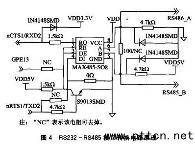 主頁(yè)(http://www.130131.com):ARM9系列遠(yuǎn)程圖像無線監(jiān)控系統(tǒng)(2) 中斷處理接口函數(shù)。該中斷處理函數(shù)在使用C端口模式完成1幀圖像采集后被調(diào)用。函數(shù)原型定義如下: static void s3c2440_camif_isr_c(int irq,void *dev_id,struct pt_regs *regs); 讀取圖像數(shù)據(jù)的實(shí)現(xiàn)函數(shù)。該函數(shù)通過dev→rdy的值判斷1幀圖像有無采集轉(zhuǎn)換結(jié)束。如果該值置1,則表示采樣結(jié)束,這時(shí)就可以從圖像數(shù)據(jù)的緩沖中拷貝數(shù)據(jù)到用戶的存儲(chǔ)空間;如果為0,則函數(shù)進(jìn)入阻塞或返回EAGAIN標(biāo)志。順便提一下,dev→rdy的值是在中斷處理函數(shù)中設(shè)置的。(實(shí)現(xiàn)代碼略——編者注) 1.3 圖像數(shù)據(jù)的壓縮 S3C2440的CAMIF接口處理得到的1幀圖像數(shù)據(jù)比較大,還要經(jīng)過進(jìn)一步的壓縮才能適合進(jìn)行網(wǎng)絡(luò)數(shù)據(jù)傳輸。S3C2440處理器內(nèi)部沒有提供硬件的圖像壓縮編碼器,但因?yàn)樗闹黝l較高,可以使用軟件來進(jìn)行圖像壓縮?紤]到CPU的處理能力和對(duì)單幀采樣圖像的清晰度有較高的要求,采用基于離散余弦變換算法(DCT)的JPEG/MJPEG方式對(duì)圖像數(shù)據(jù)進(jìn)行壓縮編碼。 1.4 圖像數(shù)據(jù)的傳輸 通信單元承擔(dān)了圖像的數(shù)據(jù)傳輸任務(wù)。在本系統(tǒng)中,有兩種通信單元可供使用。一種是GPRS/CDMA無線傳輸模塊。它們通過串口與S3C2440處理器相連接,在以太網(wǎng)絡(luò)傳輸線纜難以鋪設(shè)的環(huán)境中可以使用這種通信方式。它的缺點(diǎn)是通信帶寬小,傳輸速度慢,但是如果對(duì)實(shí)時(shí)性要求不高,也能夠傳輸高清晰的靜態(tài)圖片。另一種通信單元是10MHz的CS8900a以太網(wǎng)絡(luò)傳輸模塊。它可與局域網(wǎng)相連接,然后將監(jiān)控圖像發(fā)送到局域網(wǎng)的監(jiān)控服務(wù)器或者通過網(wǎng)關(guān)發(fā)送到互聯(lián)網(wǎng)上。這種通信方式速度高,實(shí)時(shí)性好,但監(jiān)控現(xiàn)場(chǎng)要安裝有線的以太網(wǎng)絡(luò)。 1.5 攝像機(jī)云臺(tái)的控制 攝像機(jī)的云臺(tái)控制接口采用RS485通信方式。因S3C2440內(nèi)部只有RS232的控制器,為此使用MAX485芯片設(shè)計(jì)了一個(gè)RS232到RS485的轉(zhuǎn)換接口。該電路原理如圖4所示。