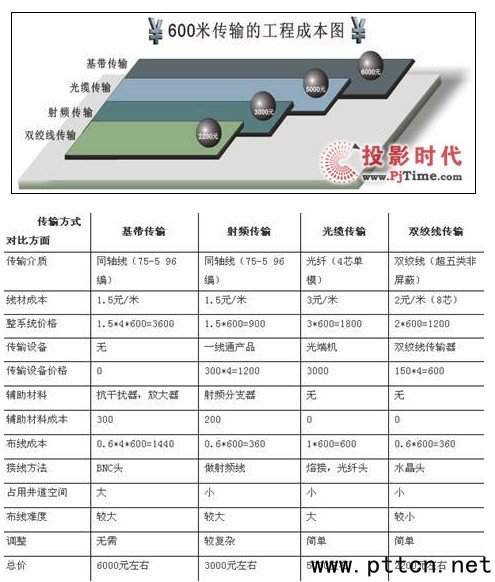 2. 為了保障農(nóng)民家庭的生命和財(cái)產(chǎn)安全,往往監(jiān)控點(diǎn)遍布全村或全鎮(zhèn)。與城市比較而言,其監(jiān)控覆蓋面積相對(duì)較小,監(jiān)控點(diǎn)相對(duì)較密集,如果采用視頻線來(lái)傳輸?shù)脑,一根視頻線只能傳輸一路視頻,對(duì)于布線工程來(lái)說(shuō)非常不便;而如果采用雙絞線來(lái)傳輸?shù)脑挘桓可以傳輸四路視頻,大大提高了線纜的利用率,而且護(hù)套管等輔助材料少、占用弱電井道空間也少。下面我們從傳輸介質(zhì),線材成本,輔助材料成本,施工成本,所需產(chǎn)品的成本幾個(gè)方面對(duì)這幾種傳輸方式做個(gè)對(duì)比:我們做一個(gè)假設(shè)從攝像頭到控制中心的距離是600米,攝像頭的點(diǎn)數(shù)為4個(gè),工程對(duì)比圖如下: