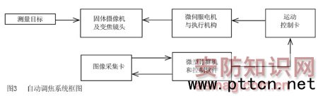 本方法的自動(dòng)調(diào)焦系統(tǒng)的結(jié)構(gòu)原理框圖如圖3所示。它由攝像系統(tǒng)(固體攝像機(jī)與可變焦鏡頭)、圖像采集卡、運(yùn)動(dòng)控制卡、伺服電機(jī)等組成。 該系統(tǒng)的工作原理采用的是逐步逼近的登山式自動(dòng)調(diào)焦方式:首先,聚焦鏡頭作任意方向搜索,找到下一點(diǎn)的評(píng)價(jià)值大于起始點(diǎn)的評(píng)價(jià)值,直到越過山頂(即曲線峰值);其次,再反向搜索,越過山頂;然后,再反轉(zhuǎn)搜索。如此反復(fù),直到找到最大值,則聚焦結(jié)束。值得提出的是,每搜索一次,步距相應(yīng)減小,才能準(zhǔn)確找到最大值。